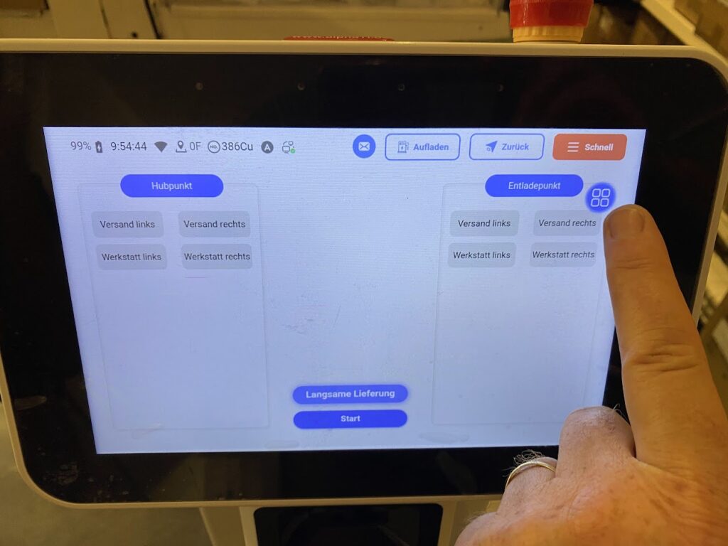 Herausforderung: Da am Bildschirm jedes der 4 Ziele ein Abfahrts- als auch ein Zielort sein konnte, hatten sich die Werkstatt Mitarbeiter schwer getan, das richtige Ziel am Bildschirm des Roboters zu wählen. Insgesamt standen auf der linken Seite 4 Abfahrtsorte und auf der rechten Seite am Bildschirm 4 Zielorte zur Verfügung. Also 8 Auswahlmöglichkeiten insgesamt, was verständlicherweise zur Verwirrung führen könnte.